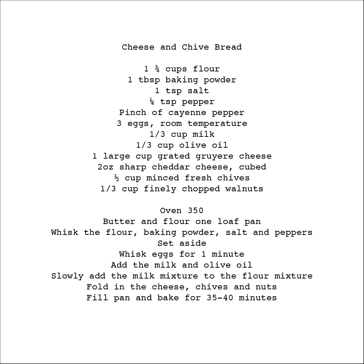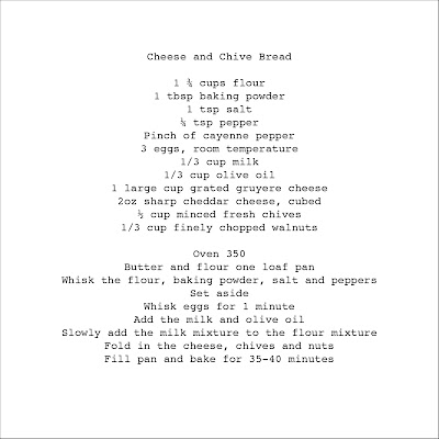 This bread was the start to a very long day. Good thing it was relatively easy to make because the mac and cheese took the greater part of the afternoon. Any bread that has cheese in it is good to me. I think this bread would be best straight out of the oven so the cheese is still gooey. Mmmm cheese. You could probably substitute jack cheese for the gruyere if you want a cheaper cheese.